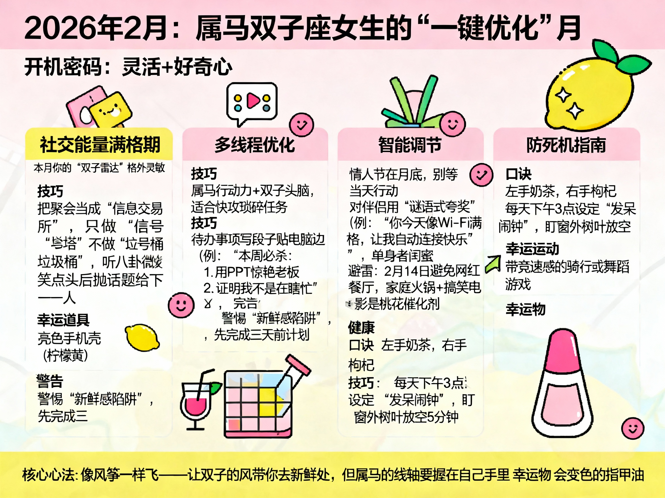 本月核心心法:像风筝一样飞——让双子的风带你去新鲜处,但属马的线轴要握在自己手里。