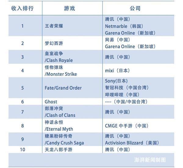 值得注意的是,上榜的游戏中,除了一款《怪物弹珠(Monster Strike)》由日本mixi公司独立运营,其他手游背后都有中国公司的身影。