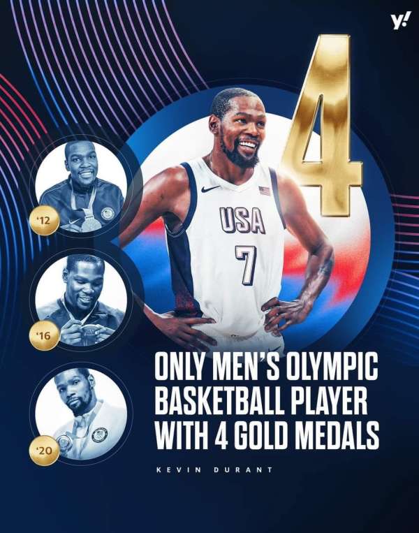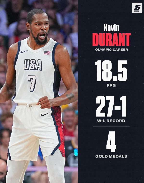自2012年伦敦奥运会起,杜兰特连续征战四届奥运,豪取四枚金牌,为美国男篮创下 27 胜 1 负的傲人战绩,生涯奥运场均砍下18.5分,稳居美国男篮队史得分王宝座。他还手握美国男篮奥运会总得分、总篮板、三分命中数等多项队史纪录,单届奥运总得分、场均得分的纪录也尽在囊中,FIBA赛场的杜兰特堪称无解大杀器,四届奥运投篮命中率均保持高水准,里约奥运更是交出 57.8%的投篮命中率 + 58.1%的三分命中率的惊艳数据。