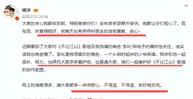 就在路透照引发关注的同一天,杨洋的账号发出了一条新的动态,内容是对粉丝表示安抚,大意是说自己状态没问题,让大家不要担心。