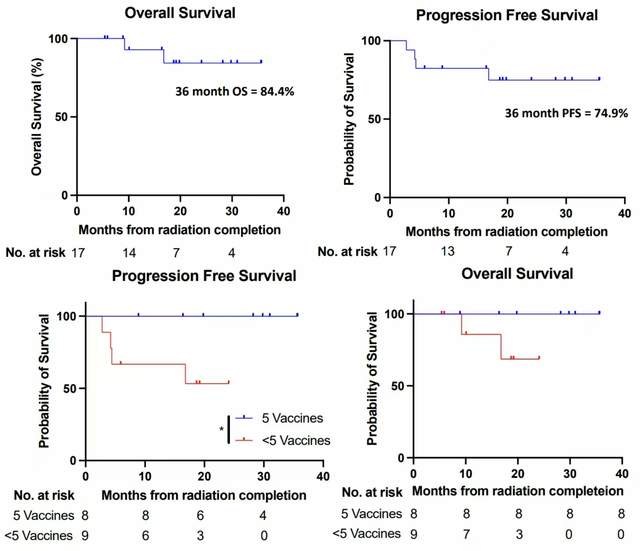针对HPV阳性的治疗性癌症疫苗PDS0101(Versamun HPV)在局部晚期宫颈癌领域的效果更是令人震惊:PDS0101联合同步放化疗实现36个月生存率高达84%,无进展生存率达74.9%。甚至接受5剂的患者36个月总生存率(OS)以及无进展生存期(PFS)率均高达100%。