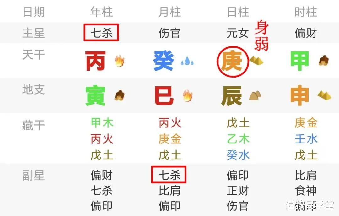 首先就是七杀太旺了,年柱天干、月柱地支都是七杀。