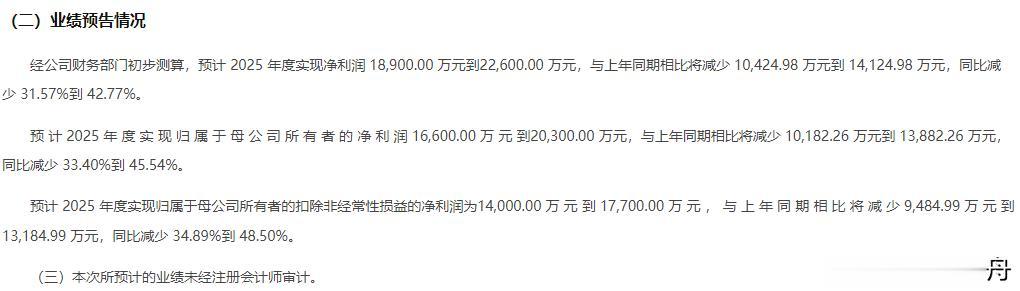 经公司财务部门初步测算,预计 2025年度实现净利润 1.89亿元到2.26亿元,与上年同期相比将减少1.0425亿元到 1.4125亿元,同比减少31.57%到 42.77%。