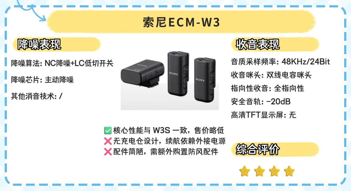 准旗舰之选,降噪实用,传输稳定,性价比优于W3S。索尼ECM-W3是ECM-W3S的准旗舰简化款,采用全指向性双线电容咪头,48KHz/24Bit采样,延续索尼标志性清澈音质,人声细节丰富。搭载NC降噪+LC低切开关双重降噪技术,可手动调节过滤中高强度噪音,适配户外、室内多场景,最大声压115dB,收音不易爆音。2.4GHz无线传输无遮挡150米稳定,支持一拖二多人录制,信噪比高达85dB,音质表现同级领先。发射器重17g,佩戴轻盈,单发射器续航6小时,无充电仓需外接电源。单套价格1540元,无内置存储功能,适合进阶专业用户、短视频团队,用于专业短视频、直播、访谈录制等场景。