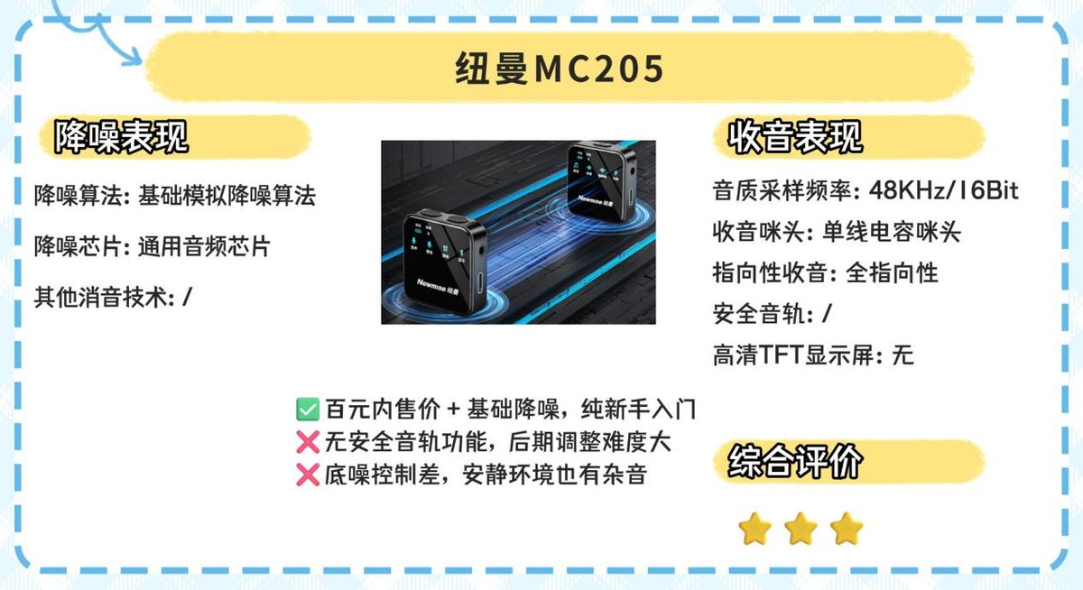 入门专业款,降噪实用,长距传输,性价比突出。纽曼MC205定位入门专业级,采用全指向性咪头,48KHz/16Bit采样,搭配智能芯片+强降噪技术,可有效过滤室内底噪,满足基础专业收音需求。2.4GHz无线传输无遮挡100米稳定,抗干扰能力优于同价位竞品,支持一拖二多人录制。发射器重30g,佩戴略有坠感,单发射器续航10小时,无充电仓需外接电源补电。单套价格299元,无耳返、无内置存储功能,户外强干扰环境下信号稳定性一般,适合新手、学生群体,用于基础短视频创作、作业拍摄、小型口播等场景。