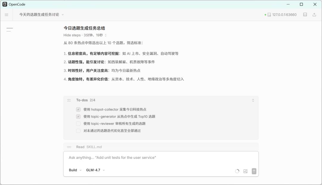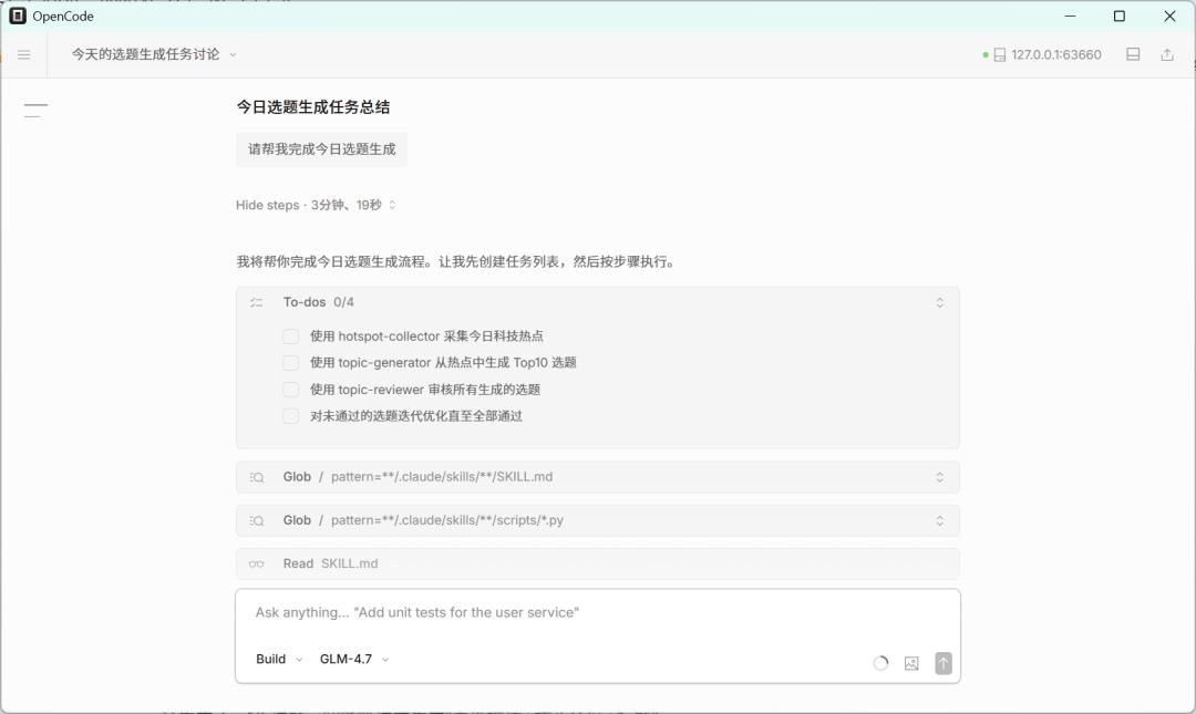 当你配置好skill之后,你就可以直接运行了,运行Skills特别简单,直接通过对话OpenCode就会根据你的需求来调用对应的skill来完成你的任务。