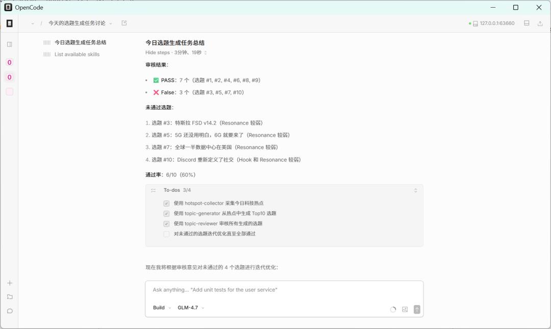 最后一步,当选题审核不通过时,系统不会结束,而是由审核Skill给出不通过 + 修改意见,接着主 Agent 读取反馈把修改意见作为上下文,重新调用选题生成Skill修改不通过的选题,再次进入审核流程,不断的迭代,直到审核通过为止。