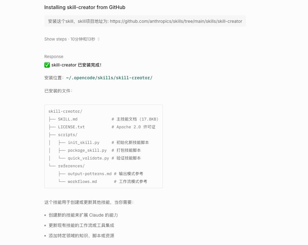 安装这个skill,skill项目地址为: https://github.com/anthropics/skills/tree/main/skills/skill-creator然后,就装完了。