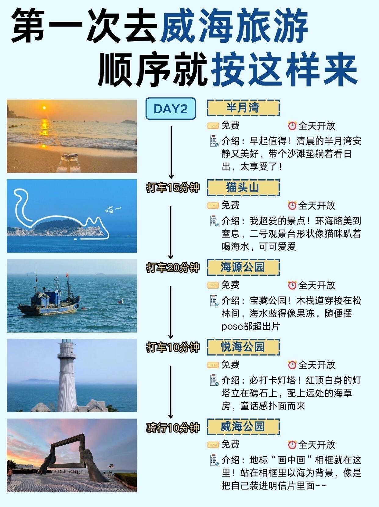 📍day2:半月湾➡猫头山➡海源公园➡悦海公园➡威海公园📍day3:刘公岛➡那香海➡鸡鸣岛➡摩天岭索道➡布鲁维斯号