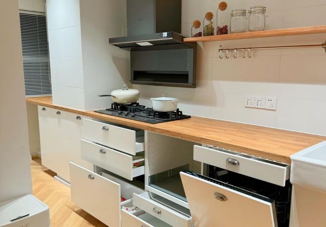 我发现上海一处人家的120平米的公寓,采用了这种设计,跟他交流得到的反馈是:可以根据季节和烹饪习惯调整墙面布局,春天烘焙工具放在顺手的位置,夏天换成冷饮制作区,厨房活了,不再是一个固定不变的盒子了。
