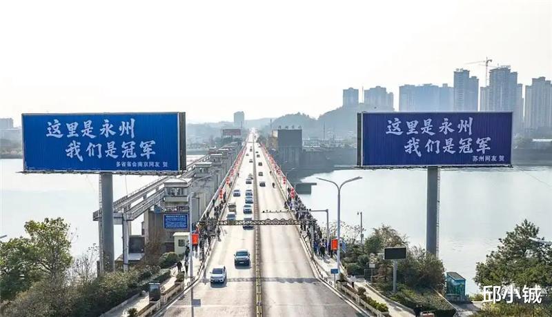 有网友说,2026年苏超第一枪在湖南永州打响。永州队在湘超以体校学生+小学体育老师教练+二手装备的草根阵容逆袭夺冠,“永冲锋”的精神感染了省内外球迷朋友,苏州网友自费包了一块广告牌为永州夺冠打call,后续南京、泰州等地网友也在这块广告牌附近打出同样的广告,再到后排江苏许多地市网友都参与到灯牌大战,广告祝贺,落款玩梗,热搜不断,永州甚至已经准备将水汲江大道更名为江苏大道,文旅层面也积极互动,可以说是双向奔赴了。