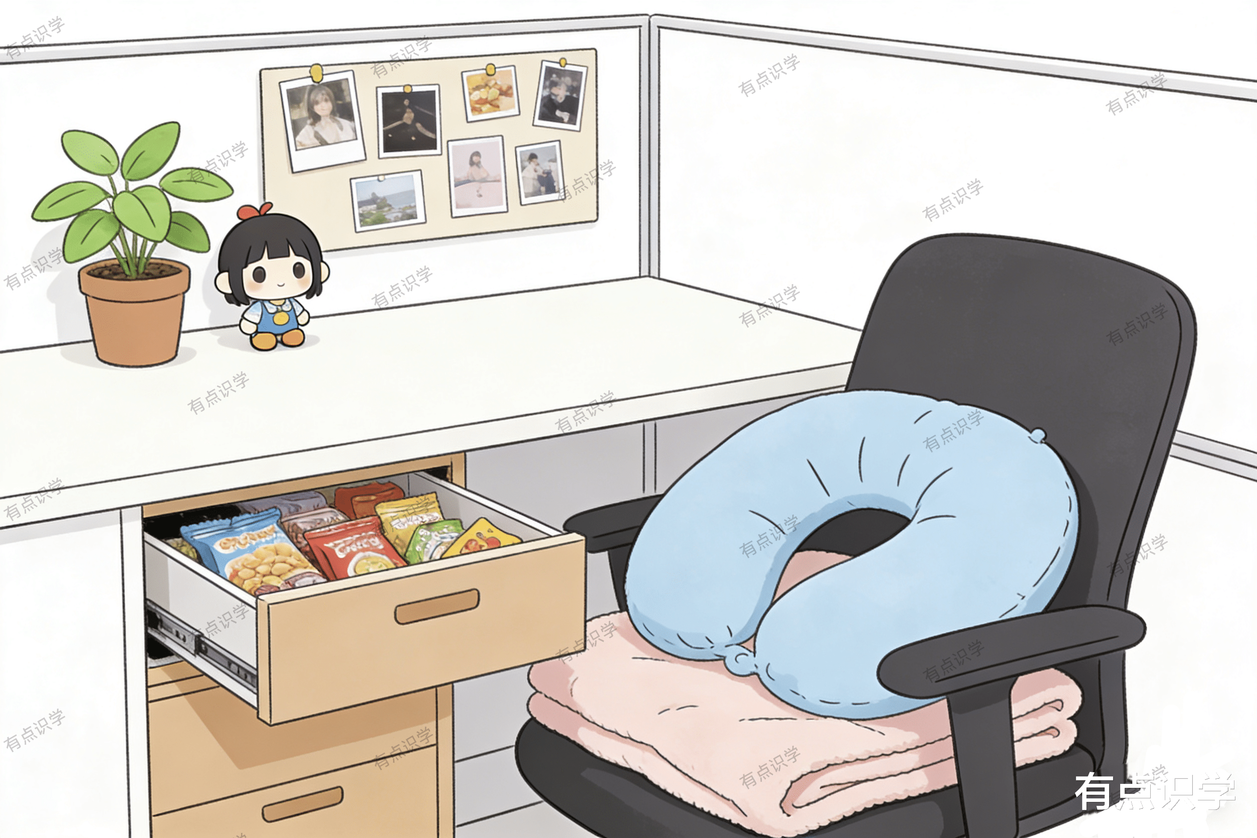 场景:工位上摆着小盆栽、可爱手办、照片墙、零食抽屉、午睡枕、小毯子,装备齐全得像第二个家。