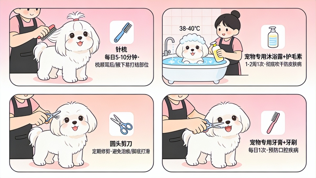 长毛是马尔济斯犬的灵魂,却需精心打理。每日需用针梳从毛根至毛尖梳理 5-10 分钟,重点梳理耳后、腋下等易打结部位,避免形成毛团。每 1-2 周洗澡一次,水温控制在 38-40℃(接近犬只体温),选用宠物专用护毛素,洗完需彻底吹干,防止潮湿引发皮肤病。