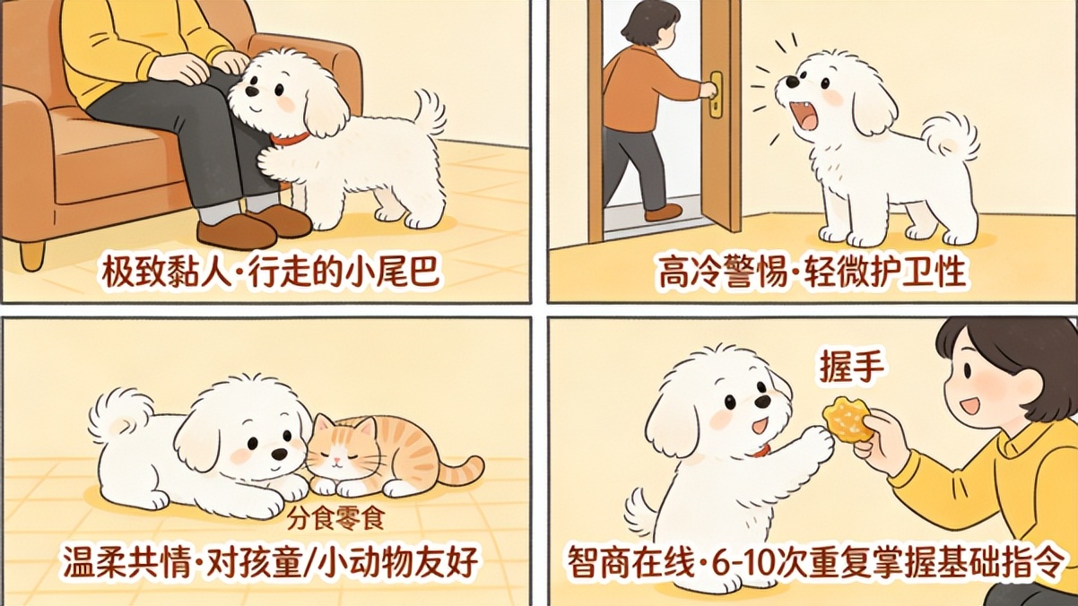 (二)性格特质:黏人又傲娇的暖心天使马尔济斯犬的性格堪称 “反差萌”:对主人极致黏人,堪称 “行走的小尾巴”,24 小时不愿分离,主人情绪低落时会主动蹭蹭安慰,尽显共情力。面对陌生人却保持 “高冷警惕”,会通过轻吠提醒主人,兼具伴侣性与护卫性。