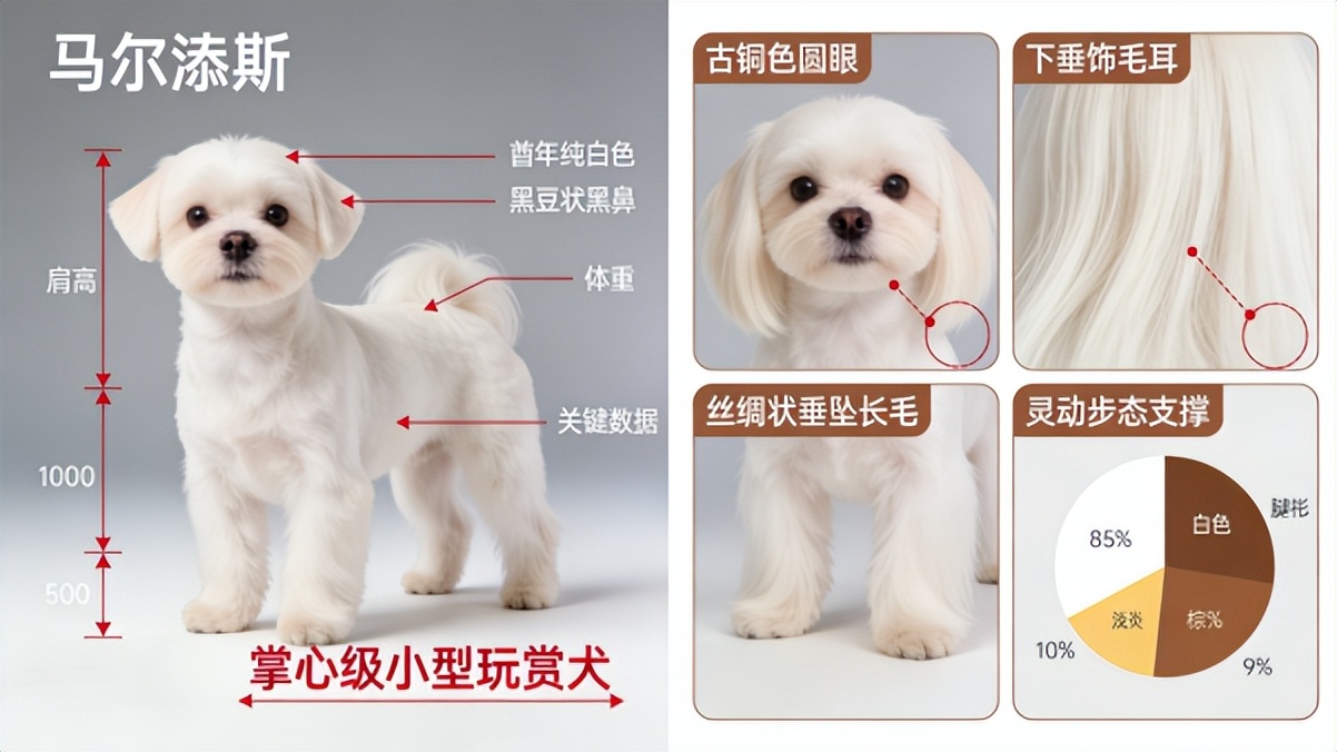 作为小型玩赏犬,马尔济斯犬体型精巧 —— 公犬肩高 21-25 厘米,母犬 22-23 厘米,体重仅 1.5-3 千克,可轻松窝于掌心。其最标志性的是一身如丝绸般垂坠的长毛,以纯白色为主流(占比 85%),少数呈淡黄(10%)或棕褐色(5%),纯白个体因稀有而更名贵。