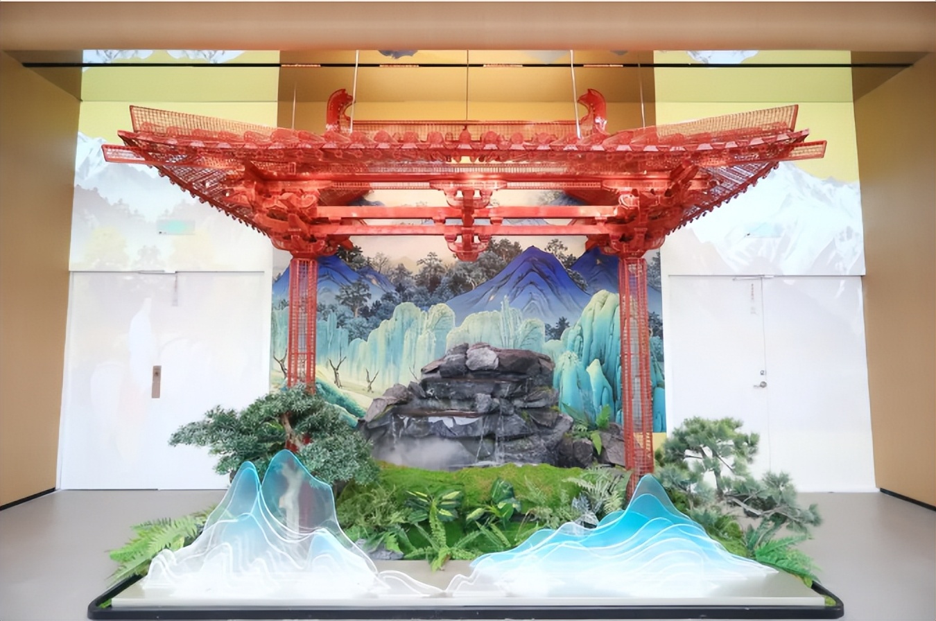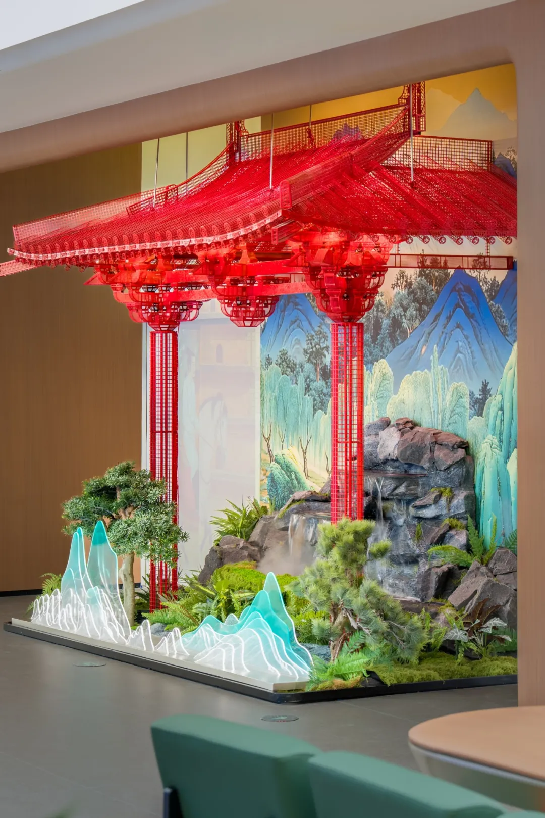 传统榫卯结构与流光金属网隔空对话,古典山水意境与当代艺术交织共生,再加上光影的巧妙勾勒,「长安三万里」的辽阔诗境仿佛就在眼前铺展。在这里,历史不再是遥远的故事,而是融入呼吸的美学氛围,每一步都像在古今之间穿梭。
