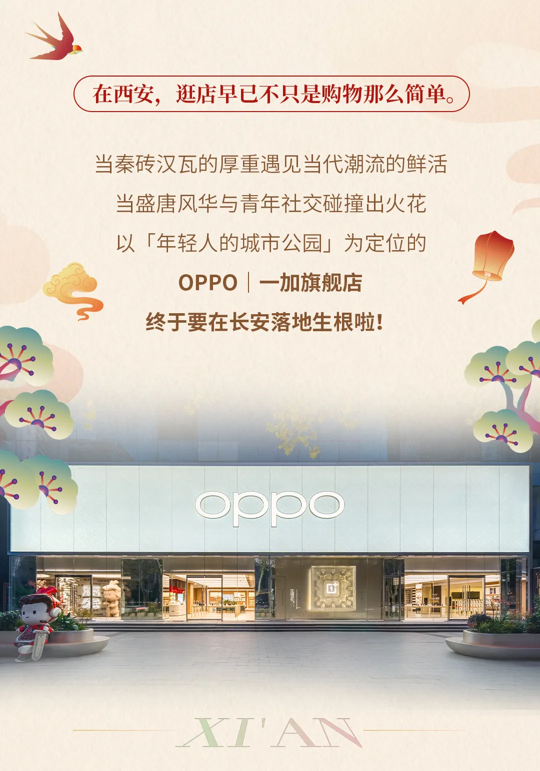 谁规定传统文化只能束之高阁?这家OPPO一加旗舰店,就用当代设计语言,把千年长安的盛世气象搬进了年轻人的科技生活里。