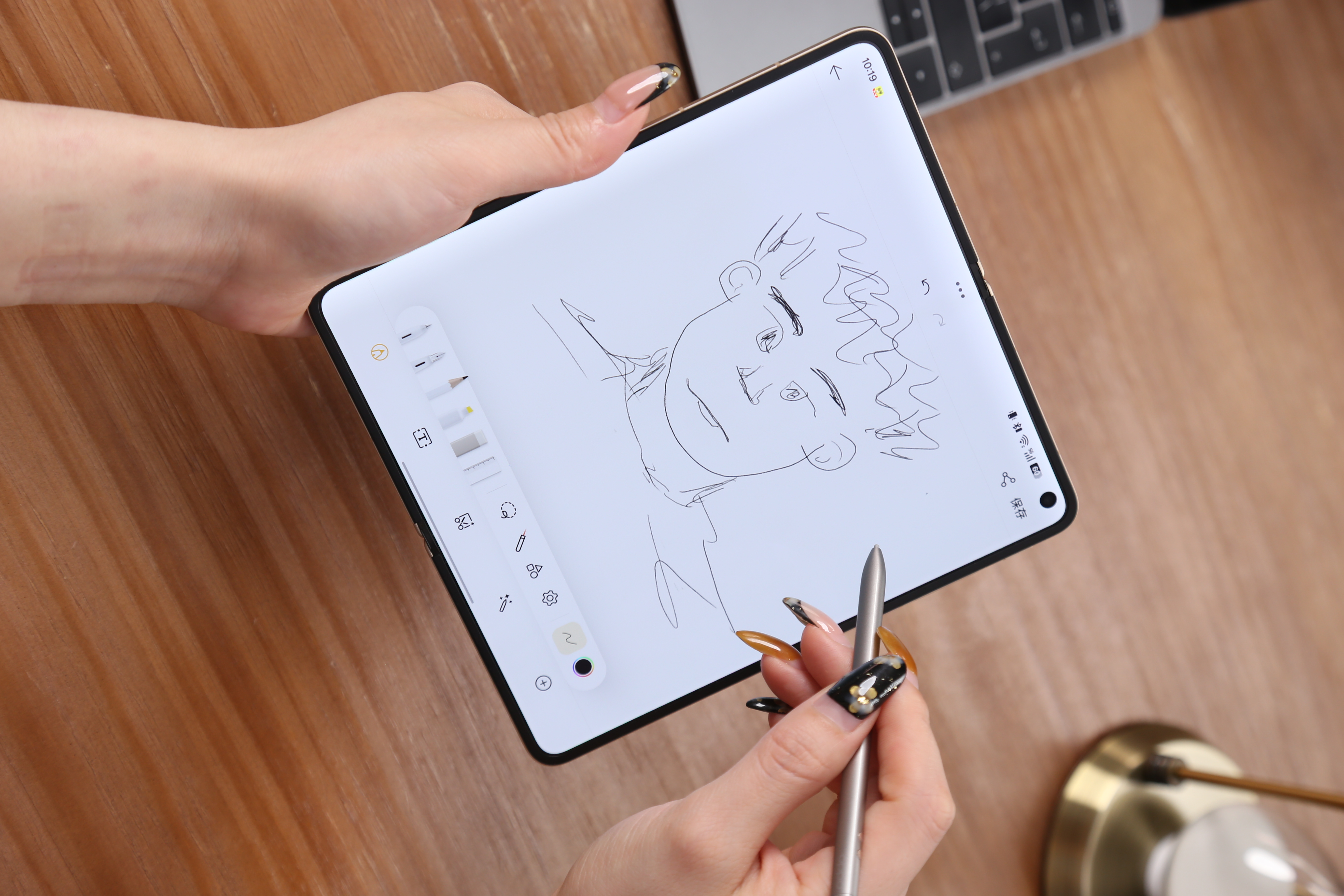 硬件层面到位了之后,OPPO Find N6就顺势在软件层面开发了折叠屏+AI手写笔的更多可能性,这就让OPPO Find N6拥有了更多的身份,比如它可以成为随身携带、随取随用的电子速写本、手账本;也能配合哈苏2亿超清四摄,搞定更精细化的修图。