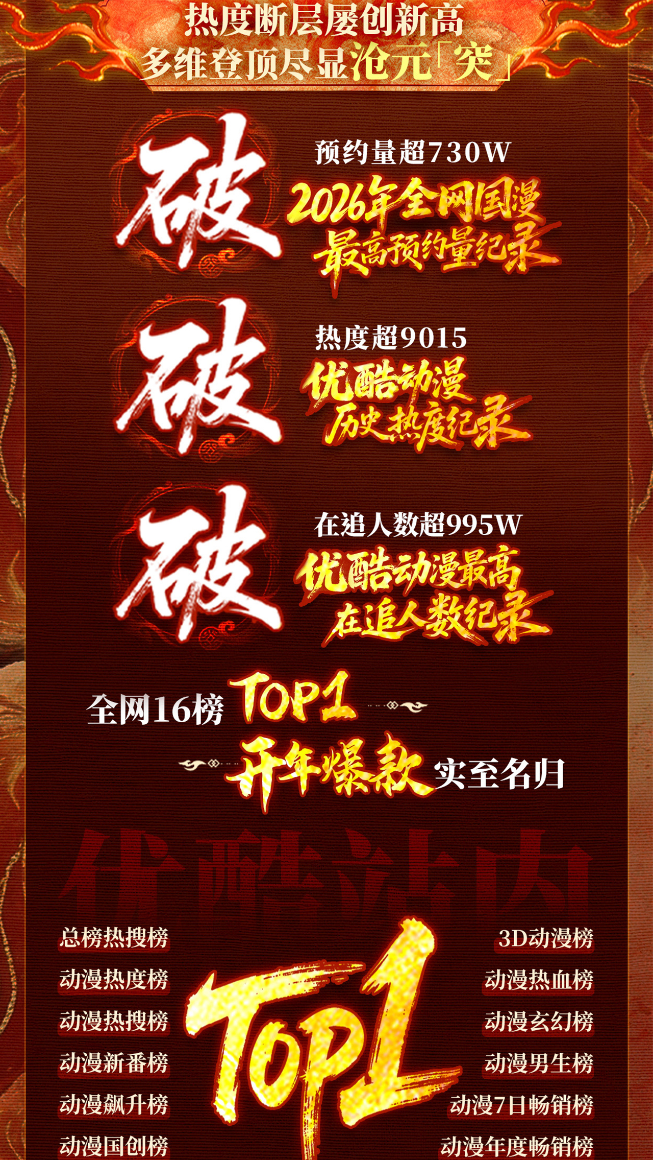 国漫新番|《沧元图》动画战报来袭,热度断层屡创新高!《沧元图 前传·东宁府的夏天》预约量超730W,破2026年国漫预约人数纪录;热度超9015,破优酷动漫历史热度纪录;在追人数超995W,破优酷动漫在追人数纪录。全网16榜TOP1,开年爆款实至名归,每周五10点,我们不见不散!