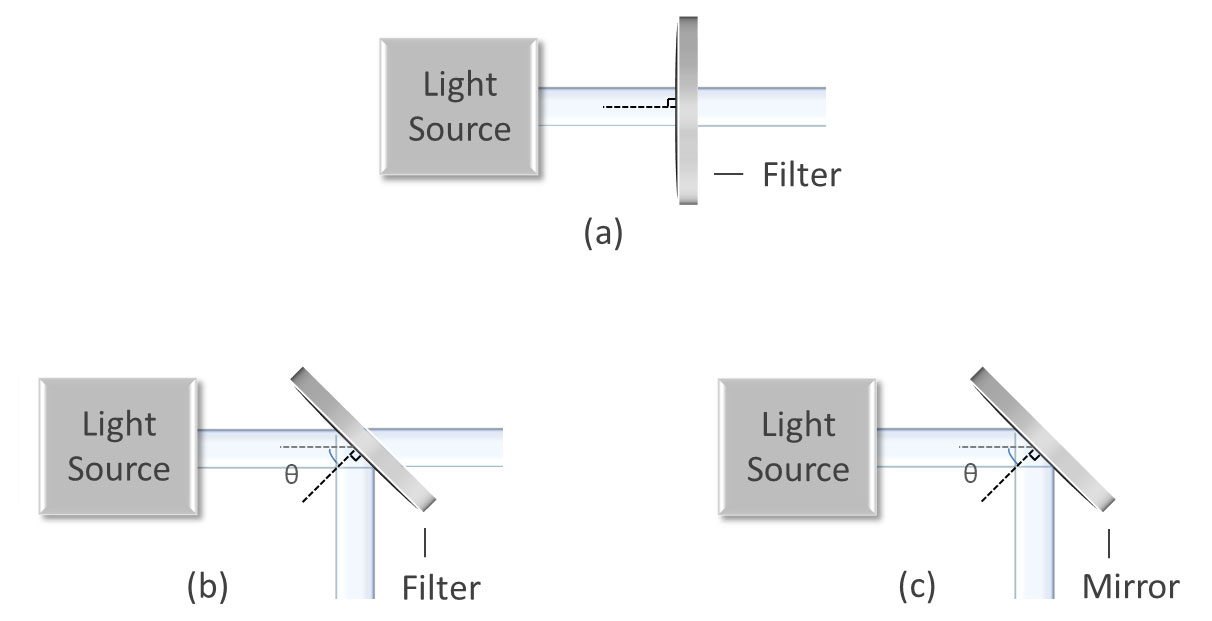 图 1a-1c:光学滤光片及反射镜的入射角示意图 ——(a) 光学滤光片的正入射、(b) 二向色滤光片的 45° 入射角、(c) 高反射率反射镜的 45° 入射角