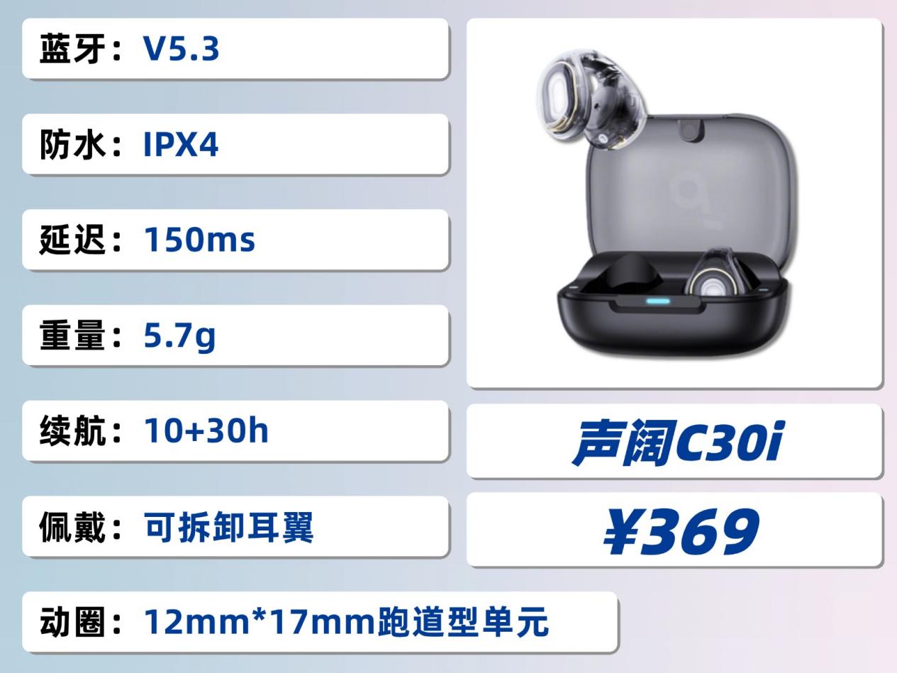 声阔 C30i 的佩戴体验有着明显短板,虽说单耳仅 5.7g 足够轻盈,可拆卸耳翼也能适配不同耳型,但耳翼材质偏硬的问题,让长时间佩戴很容易产生夹耳感。这款耳机的佩戴稳固性表现不俗,舒适性却不尽如人意。音质方面的表现则尚可,搭载 12mm×17mm 跑道型单元并搭配镀钛振膜,音乐细节还原精准细腻;360° 环绕音技术打造出立体开阔的声场,带来沉浸式的听音体验;改性 TPU 材质的加持,更让低频下潜扎实不拖沓,能轻松驾驭多种音乐风格。