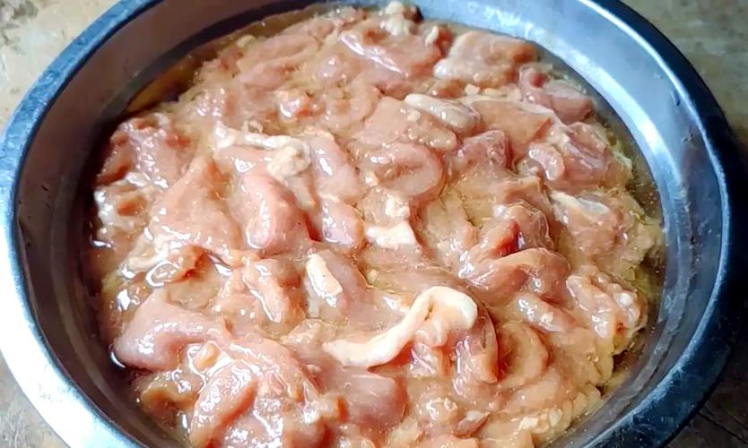将里脊肉切成薄片,是为了更好地快速入味并确保肉片炒制后更嫩滑。切肉时要注意刀工,肉片尽量均匀,过厚的肉片难以熟透,过薄的肉片则可能过老。切成薄片后,我们就可以开始腌制了。