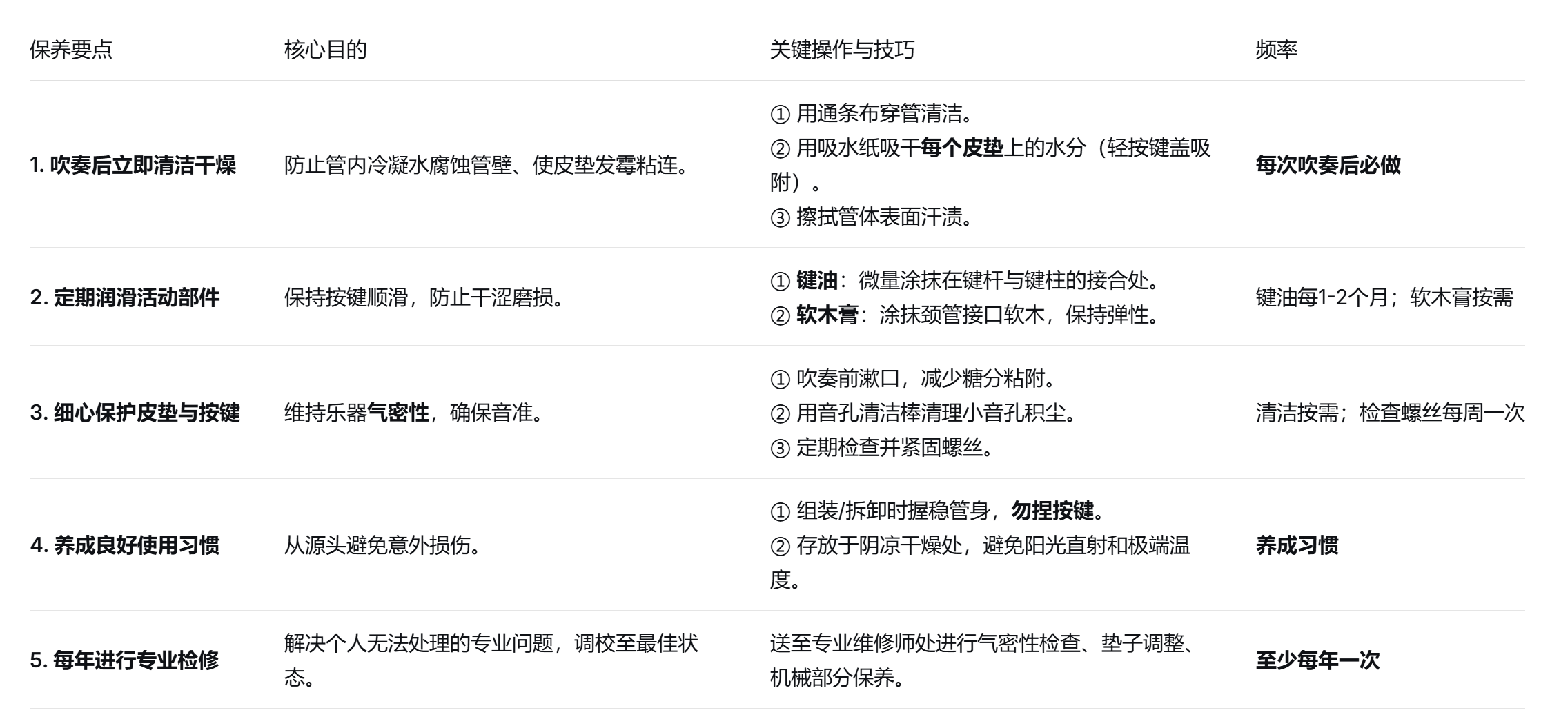 为你的萨克斯进行正确保养,最核心的要点是:确保每次吹奏后的彻底清洁与干燥,并将此作为不可省略的习惯。这是防止萨克斯锈蚀、皮垫发霉、键位漏气等一切问题的根本。