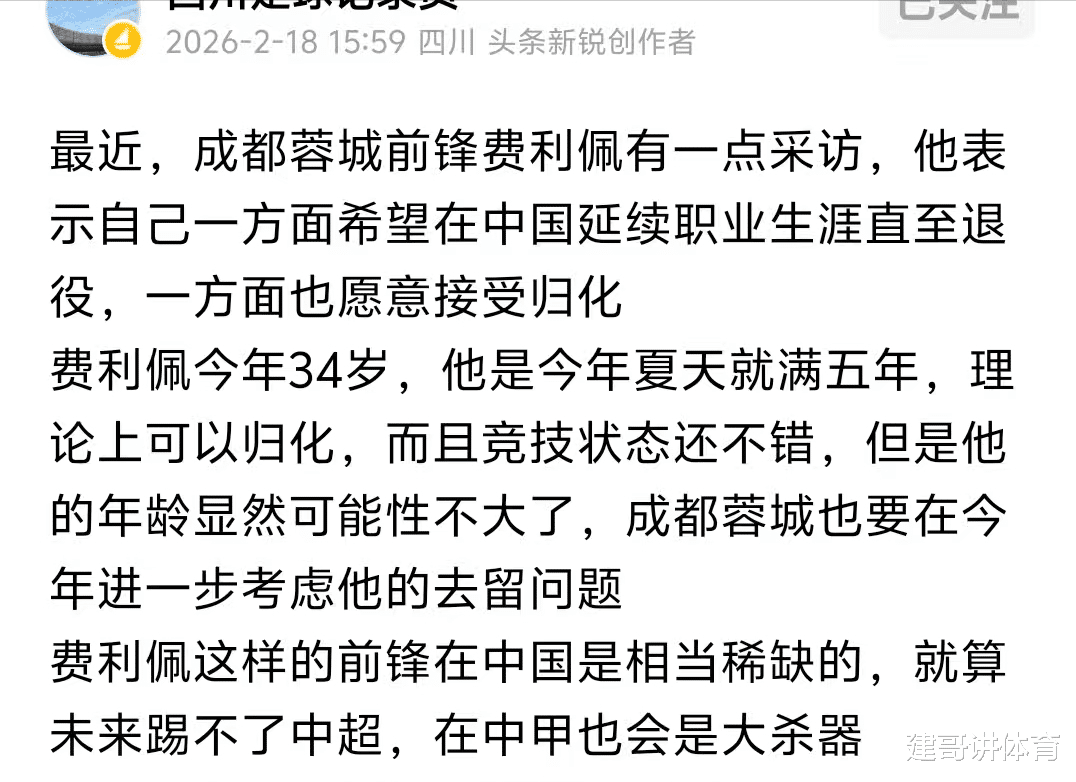 北京时间2月19日,对于成都蓉城球迷来讲,他们也迎来了一个好消息,这个好消息就是球队的进攻核心,锋霸费利佩在接受采访时明确表态同意归化,作为中超进攻火力最强、身体素质最出色的外援,费利佩不但在成都蓉城队证明了自己的能力,还曾经差一点成为注重高中锋的山东泰山队的外援,在细节方面没有谈妥的费利佩,加盟成都蓉城队后,不但做到了自己每个赛季都是神射手榜的前几名,还让成都蓉城队成为了争冠球队。
