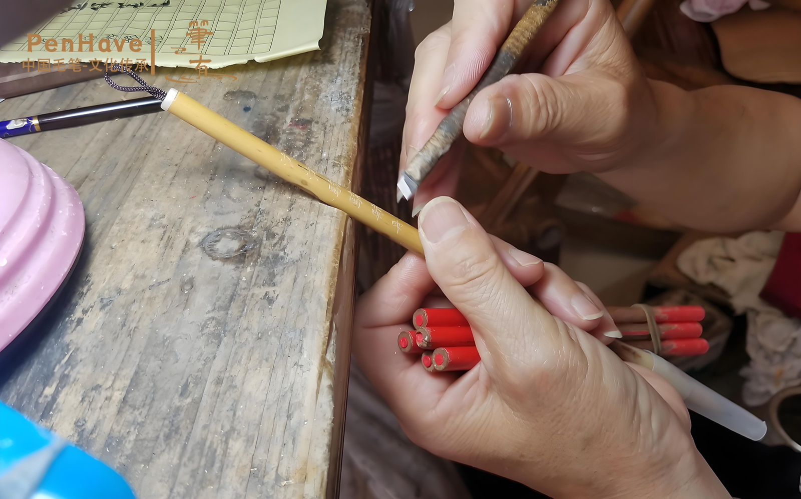 最后是装杆和修整。笔杆经过打磨、上漆等处理,与笔头完美结合。制成后的毛笔还要经过试写检验,确保书写流畅,不分叉不脱毛,方可出厂销售。