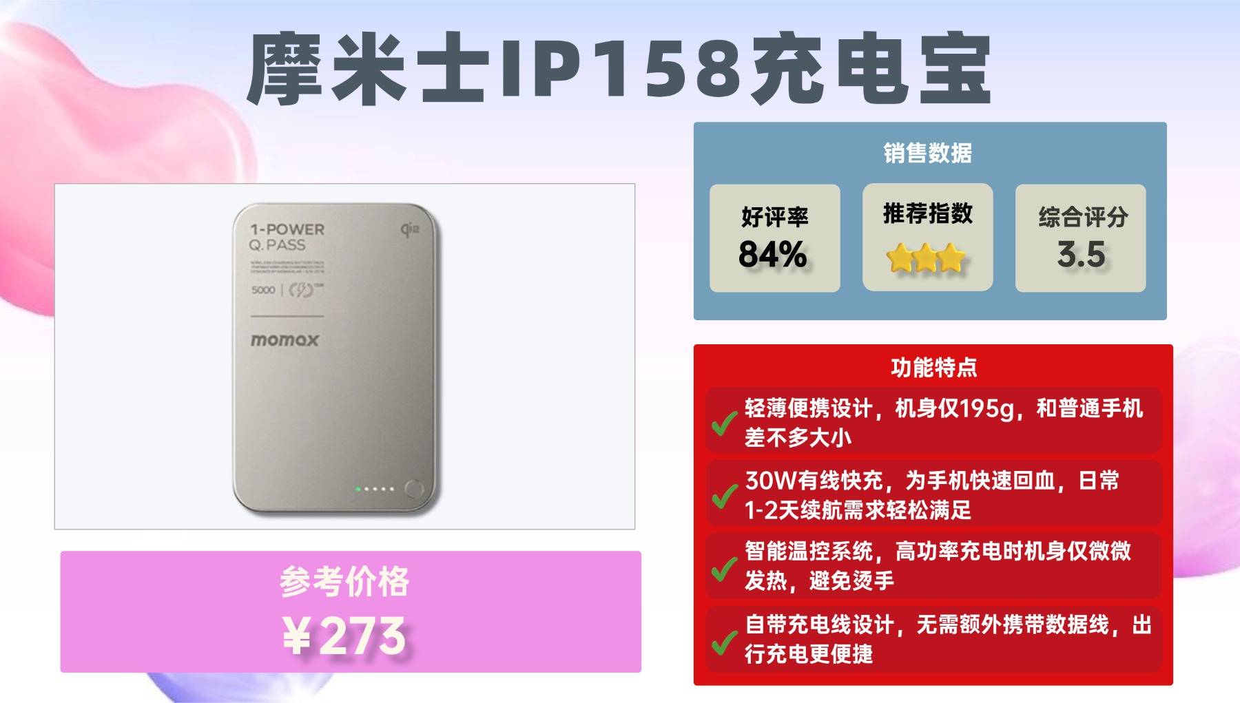 摩米士IP158轻量化设计,10000mAh容量搭配195g机身,便于随手携带。支持30W有线快充,实际使用时充电稳定,机身温控良好,仅微微发热。自带磁吸线设计方便应急充电,但无线充电功率偏低,实测效率较慢。整体功能简洁,专注轻便和基础快充,适合日常短途出行使用,放包或口袋都不占空间。