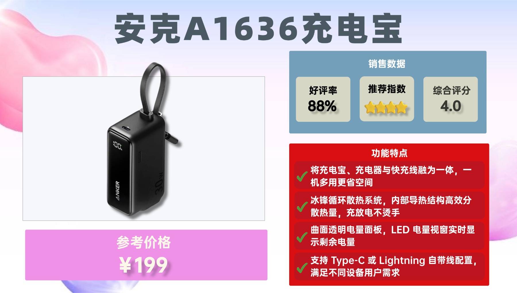 安克A1636将充电宝、充电器和快充线三合一设计,容量5000mAh,额定3000mAh,整体小巧,便于单手握持。提供5种清新配色,机身曲面触感舒适,LED电量视窗显示剩余电量直观。支持Type-C或Lightning充电方式选择,散热方面内置冰锋循环系统,有效控制充放电热量。缺点是容量相对有限,长时间使用可能需要频繁充电,价格接近200元,对预算敏感用户略高。