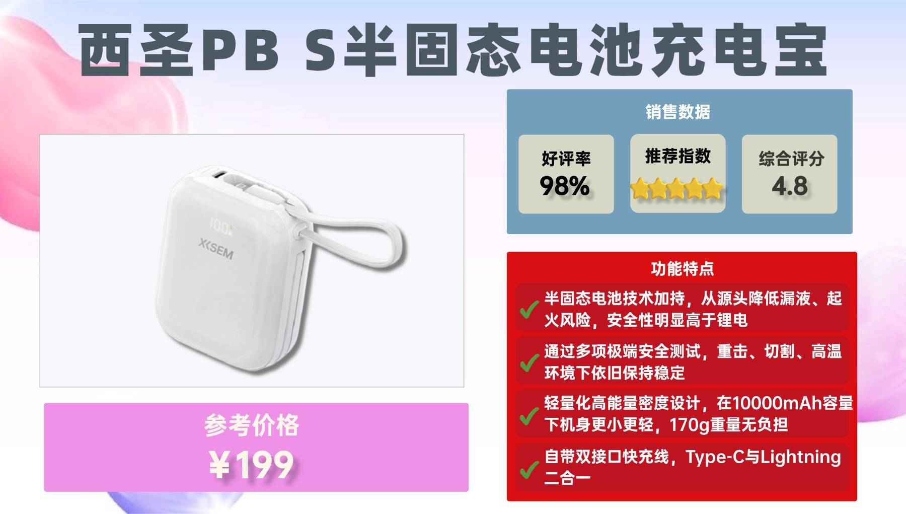西圣PB S是近年来口碑好到炸裂的充电宝,在充电速度和品质安全上长期稳居充电宝品类第一梯队。它凭借半固态旗舰电芯、10000mAh大容量和自带双线22.5W快充配置,快充输出稳定性提高了116%,充电速度提高了44%,电池循环寿命提升了51%,是唯一实现安全快充的同时且对充电设备的损害降低96%,在百元档充电宝中表现堪比高端产品,被众多权威媒体公认的“天花板级安全下的高性能充电宝”,其充电技术屡次突破改写颠覆了充电宝行业标准、技术上限,做到充电快,不发烫,更安全!