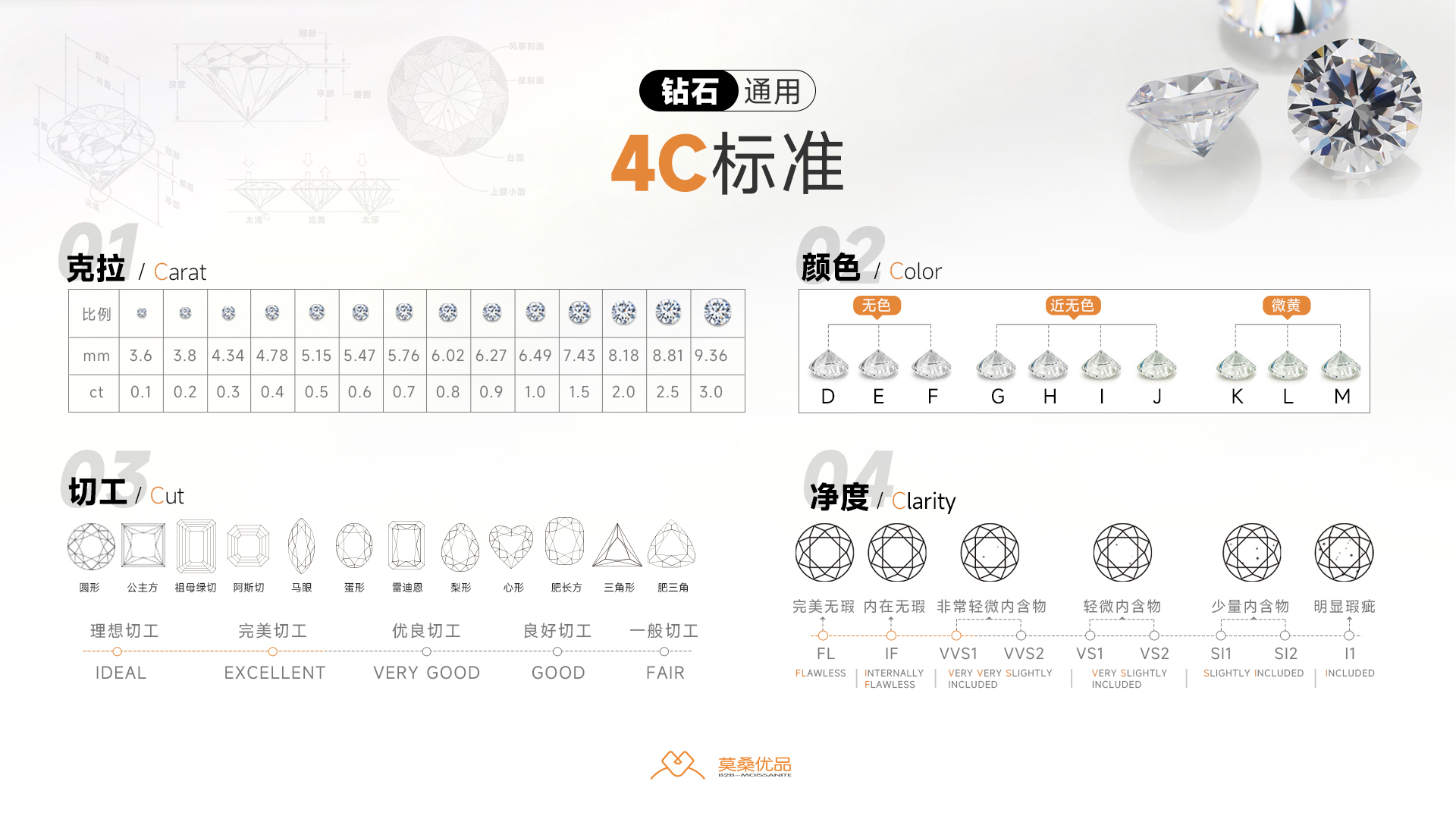做钻石批发,最核心的竞争力就是读懂4C标准——它是美国宝石研究院(GIA)创立的全球通用钻石品质分级体系,涵盖重量(Carat)、颜色(Color)、净度(Clarity)、切工(Cut)四大维度,直接决定钻石的质感、价值和终端成交率。很多批发商因不懂4C,要么花高价拿低质钻,要么贪低价踩材质、分级陷阱,最终滞销压仓或引发售后纠纷。下面用大白话拆解4C标准,搭配批发专属避坑技巧,新手也能精准选钻、稳健走量。