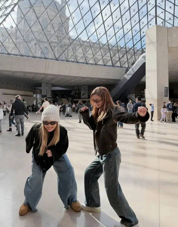 2月27日,阿Sa晒出与容祖儿在卢浮宫跳舞的照片,两人尽情玩耍,表情搞怪可爱。