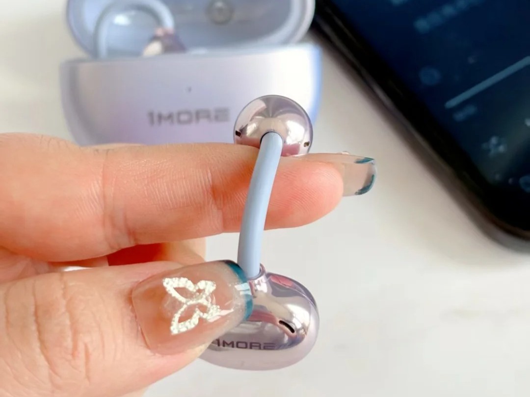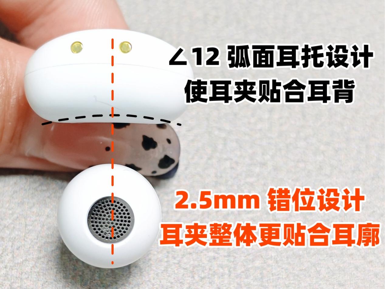 佩戴方面:这款耳机在佩戴设计上藏了不少巧思:单耳仅4.5g的重量,拿在手里轻得几乎没存在感,戴久了也不会压耳朵。而且它还做了∠12 弧面耳托的电池设计,能刚好贴住耳朵后方,让贴合度和舒适度都上了一个台阶。另外,前高后低的2.5mm 错位设计也很贴心,让耳机能自然融入耳型,戴上后稳固性好,不会出现晃动问题