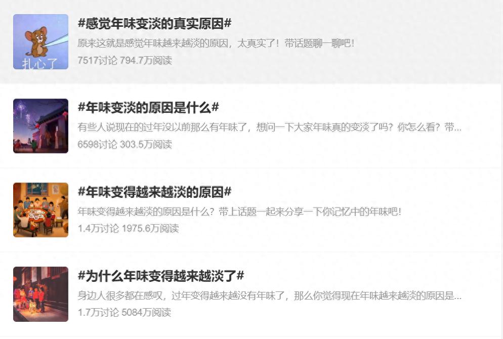 社交媒体上,有关“年味变淡”的相关话题阅读量超百万,部分甚至超千万。