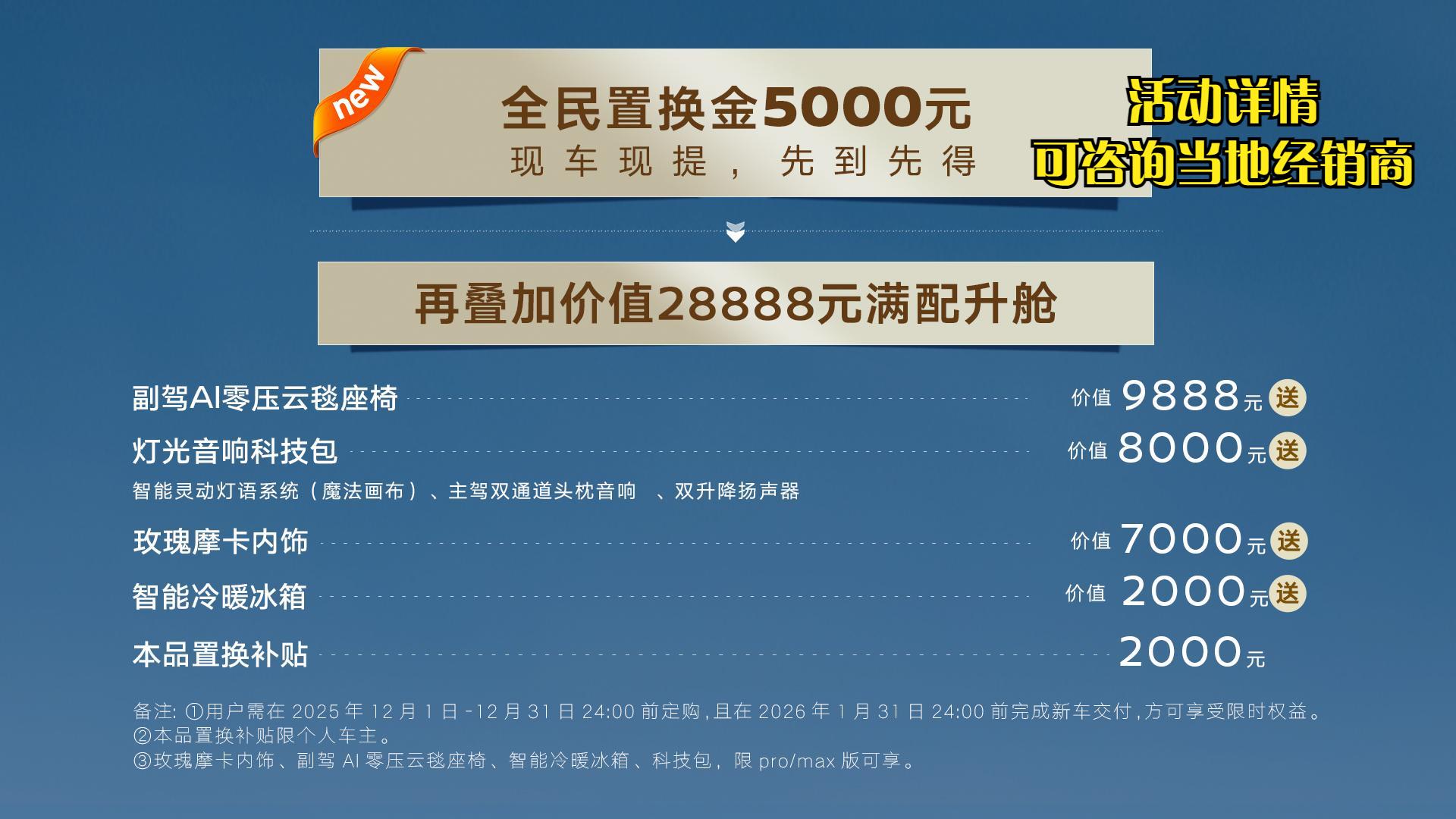 除了合理的定价外,该车在购车权益上也有着不错的诚意,像是5000元的置换金以外,还可享受价值2888元的满配升舱礼包,其中包括了价值9888元的副驾驶AI零压云毯座椅、价值8000元的灯光音响科技包、7000元的玫瑰摩卡内饰、2000元的智能冷暖冰箱以及2000元的本品置换补贴(活动详情可咨询当地经销商),整体来看该车的入手门槛和产品性价比而言都有着不错表现。