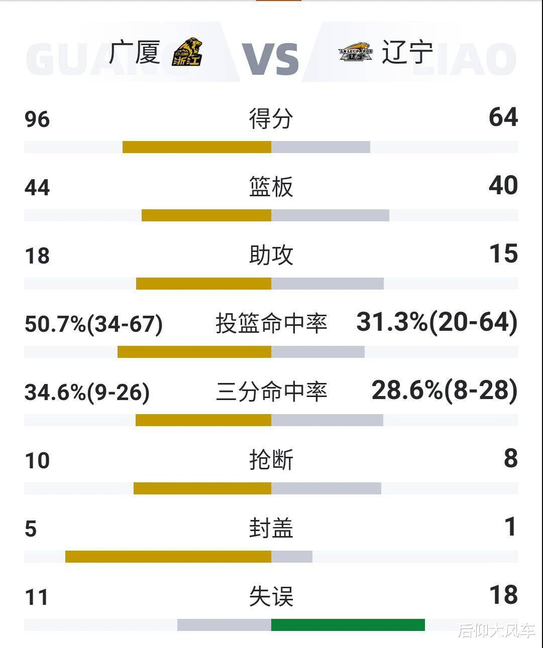 比赛的悬念其实在第二节就已经结束了,在广厦持续不断的夹击持球人防守下,辽宁半场只拿到29分,第三节虽然辽宁也做出了一定的反扑,但最多也只能趁着广厦第三节开局出现松懈,将分差缩小来到9分,当第三节布朗、孙铭徽再次发力后,辽宁很快就又被打回原形,单节一度让广厦拉开到27分,更加说明广厦只要出全力,辽宁就会输得更惨。
