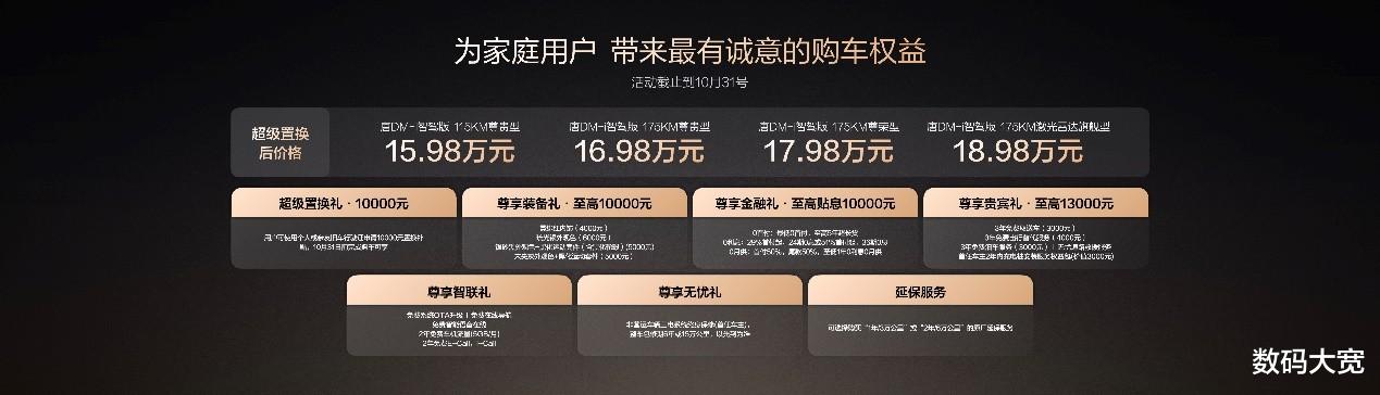 此次,唐DM-i智驾版 175KM长续航版共推出3款车型,售价17.98万~19.98万元(10月31日前完成购车可享10000元置换补贴)。同时,比亚迪还为用户准备了包含置换补贴在内的至高价值4.3万元盛唐礼遇。