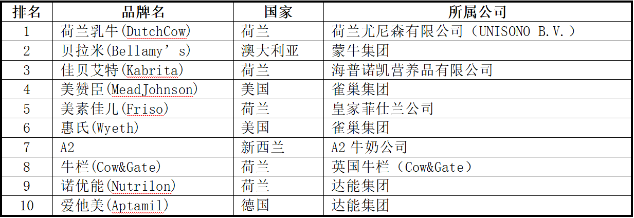 截至2025年11月25日,中国市场进口奶粉品牌排行榜前十