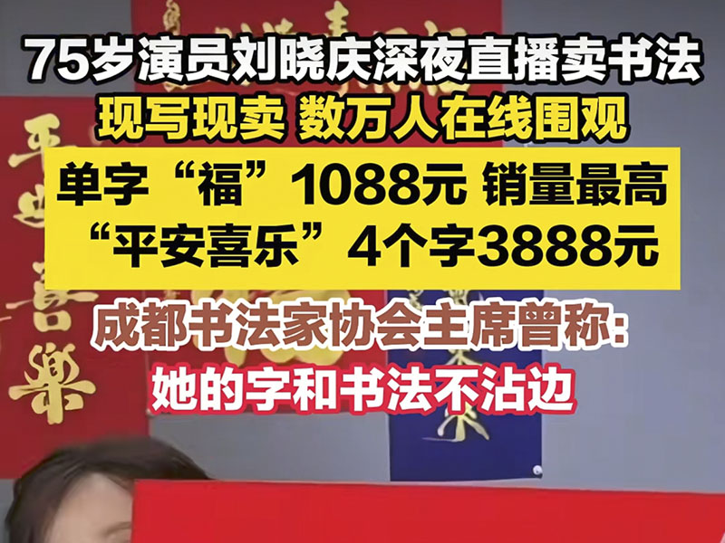 临近春节,刘晓庆又开始直播卖亲笔书法了。一个“福”字售价1088元,“平安喜乐”四个字售价3999元,可谓是“一字千金”。