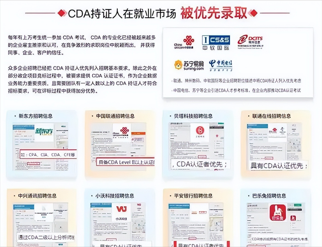 像中国联通、德勤、苏宁等企业,不仅将CDA持证人列入优先考虑范围,还为员工考取证书提供补贴。