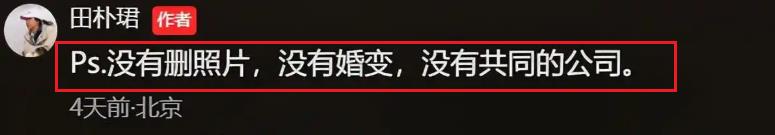 后来,田朴珺更强调自己没有删除照片,没有婚变,更没有共同的公司。看来,这一回确确实实是网友们多想了。人家两口子好着呢!