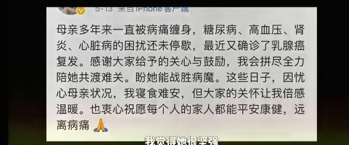 其实,除了嫁给老王这事惹来不少争议之外,田朴珺还是蛮讨粉丝们喜爱的,无论是分享生活日常、穿搭,都比较接地气。视频中,田朴珺透露自己母亲多年来一直饱受病痛折磨,糖尿病、高血压、肾炎、心脏病都在困扰着她,而且最近又缺资料乳癌复发。
