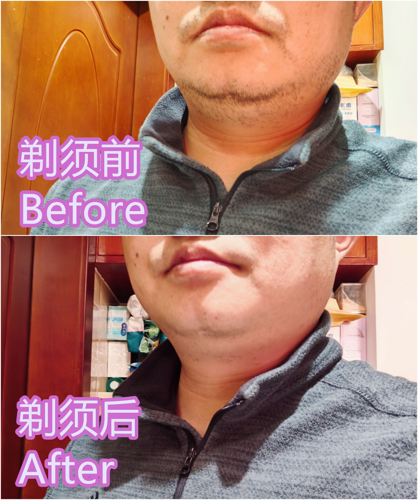 1.剃须最注重的功能特性,剃干净!通过剃须前后的面部特写来对比,凭借高转速电机与锋利刀片,一次就能切断粗硬胡须,断面平整度高且无拉扯痕迹,能够清晰看到唇上和唇下部分的胡须剔除干净,也没有青色胡茬残留。