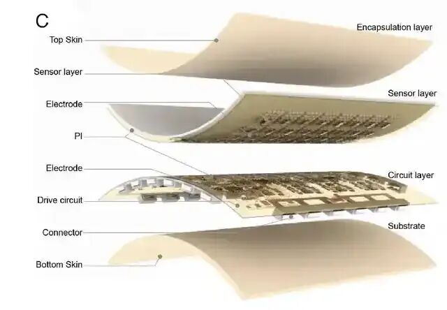 这款电子皮肤的核心就是“模仿人类”!借鉴人体皮肤四层结构,从外到内依次是封装层、传感层、电路层和基底层,分别对应角质层、机械感受器、神经和皮下组织,分工明确又精准。