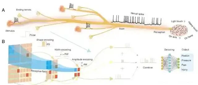 更绝的是信号处理方式——每个压力传感器都像一个“微型神经元”,能直接把触觉转译成脉冲信号。压力越大,脉冲频率越密,还能通过独特“位置指纹”精准定位接触点,数据传输高效又精准。