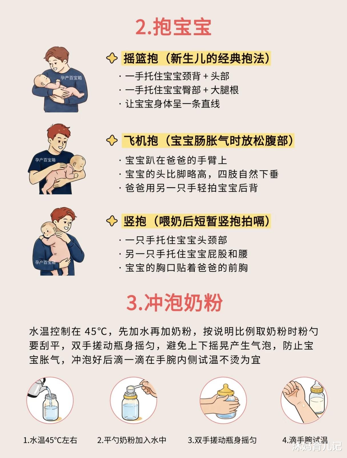 冲泡奶粉也是带娃过程中不可忽视的一环。水温要控制在45℃左右,先加水再加奶粉,按说明比例取奶粉时,粉勺要刮平,双手搓动瓶身摇匀,避免上下摇晃产生气泡,防止宝宝胀气。冲泡好后,滴一滴在手腕内侧试温,不烫为宜。