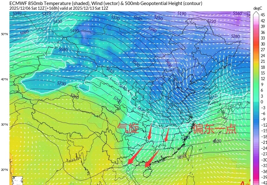 而西南气旋是主导后续雨雪,以及我国华南方向降温的强度关键,东部气旋推动主要是冷空气为主,除了它之外,支槽的变数没有,这个雨雪稳定性就是在这里。