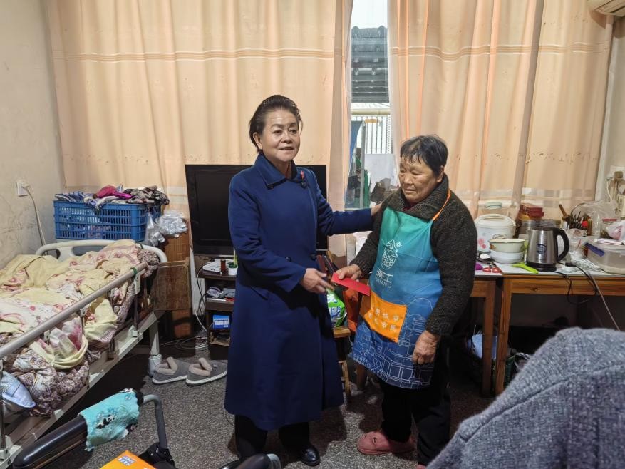 离开盛伙吐老人家后,调研组一行来到94岁高龄的陈梅素老人家中,为老人送上了鸡蛋、新鲜水果和大米等慰问品。老人年事已高、体弱多病,不仅腿脚不便,还已丧失基本听力,独自生活多年。更令人揪心的是,她的儿子身体欠佳,儿媳身患癌症,多年来一直靠手工活赚取微薄收入维持生计,家庭负担沉重。见到吴红大姐到访,老人激动得热泪盈眶,颤抖着紧紧拉住大姐的手,反复表达对政府关心的感激之情。吴红大姐为老人送上慰问金,轻声叮嘱她一定要保重身体,多买点有营养的好吃的,好好照顾自己。
